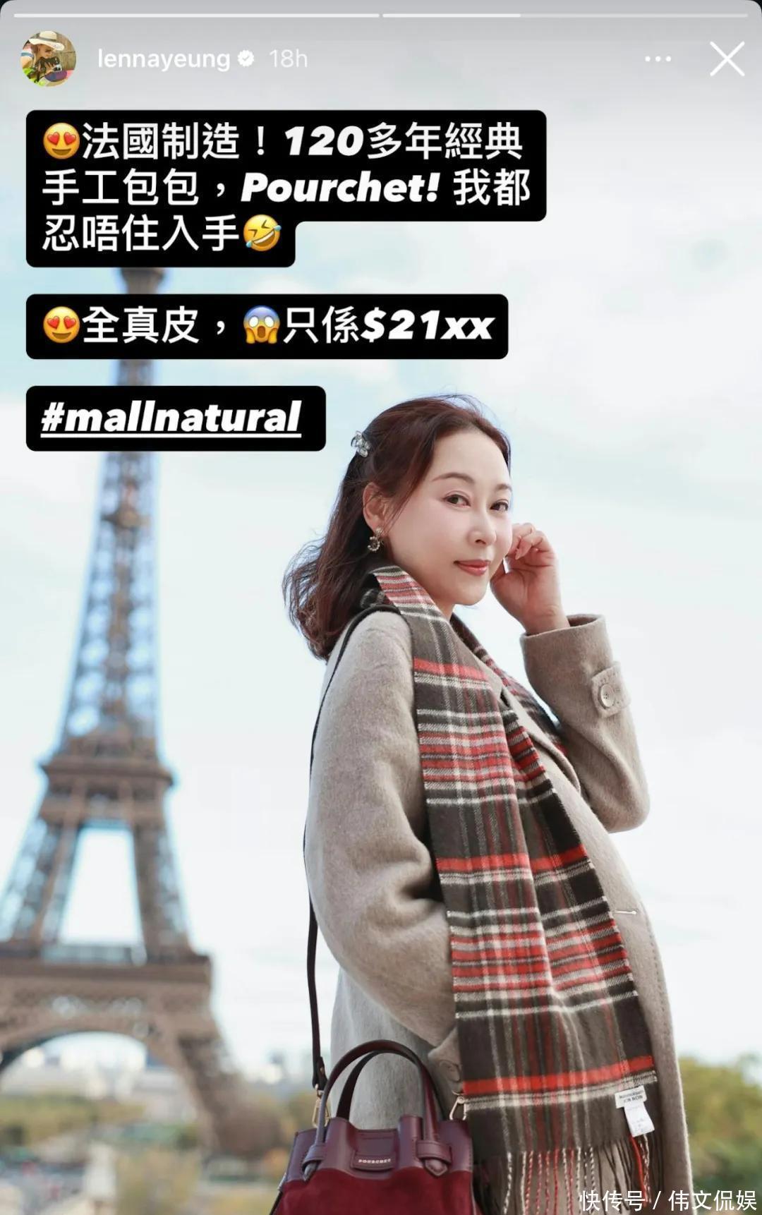 近日杨卓娜在社交网上载一张在巴黎铁塔前拍下的照片,照片中杨卓娜背着一个红色包包,大赞仅需2100多元,她发文:法国制造!120多年经典手工包包,Pourchet!我都忍不住入手 全真皮,而只需$21xx。